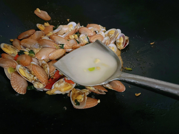 转大火,下花甲翻炒几下,锅边淋入料酒。