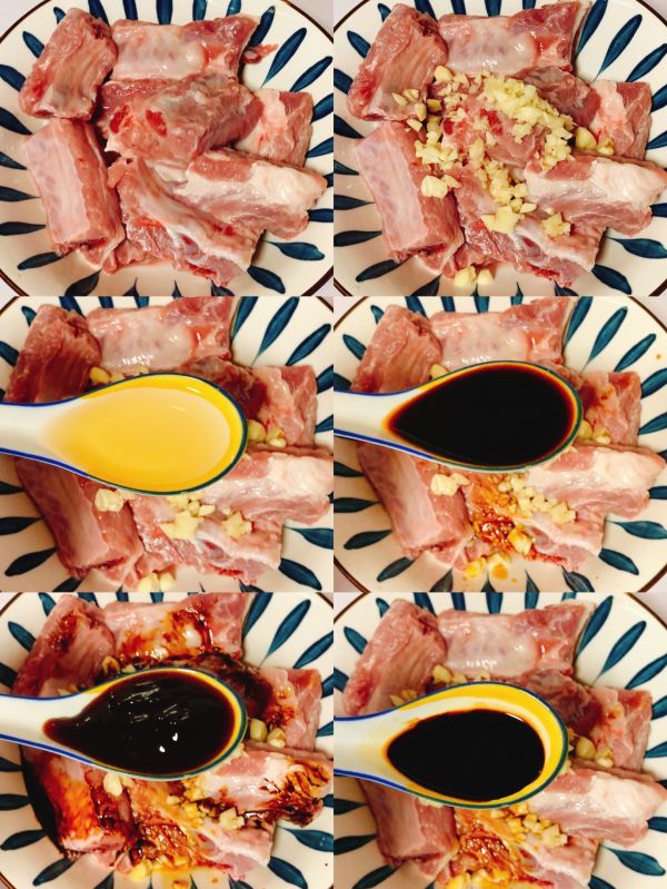 排骨加入两勺蒜末+一勺料酒+两勺生抽+一勺蚝油+半勺老抽+适量黑胡椒粉+半勺白糖+少许盐抓匀腌制一个小时以上