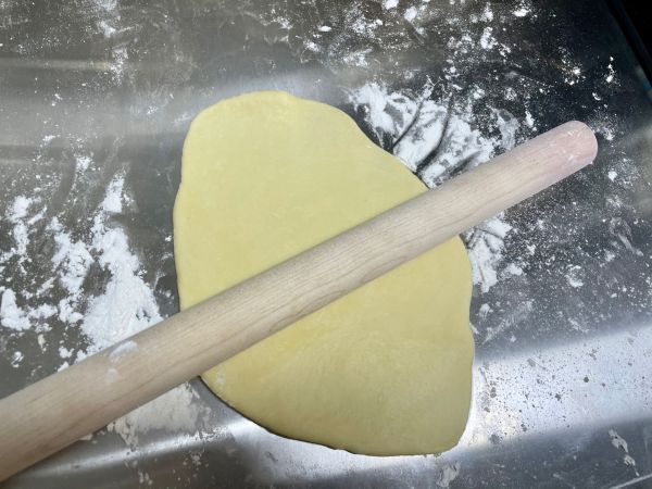 分好后按顺序,从第一个面团开始(相当于静置了10分钟),擀成橄榄状,擀的时候往两边用力,让中间宽一些。