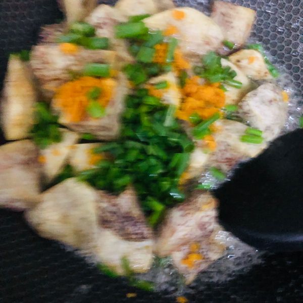 芋头,葱,咸蛋黄 使每块芋头都均匀裹上葱咸蛋黄