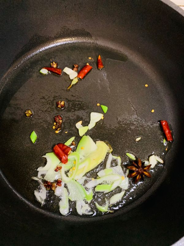 起锅烧油……放葱姜花椒八角冰糖干辣椒炒香
