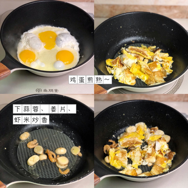 1⃣️、热锅下油,煎熟鸡蛋。盛出备用。 2⃣️、热锅下油,下姜片、蒜蓉、虾米,炒香。