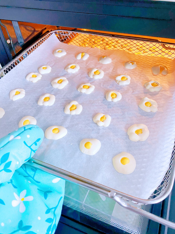蛋白霜装入裱花袋里,取出定型好的蛋黄溶豆,围着挤一圈就是荷包蛋的形状啦!我还挤了几个花朵形状的,然后放入烤箱90度继续烘烤40分钟
