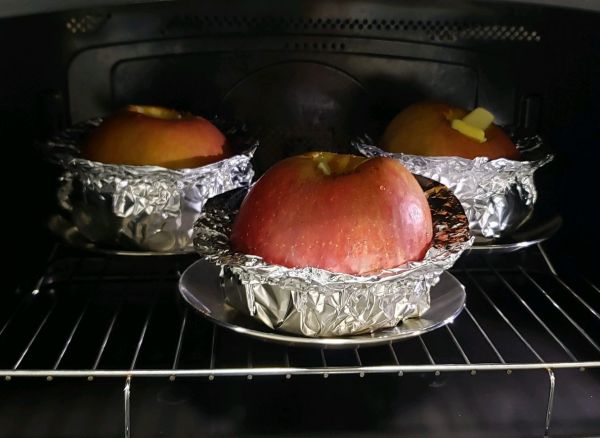 1.苹果皮要洗干净,用小刀沿苹果上端削一圈,刨出苹果核,注意别把苹果底削穿啰。 2.往苹果里放入桂圆肉、红糖粉、红酒、肉桂粉、黄油。 3.用锡纸包住苹果,捏紧锡纸露出苹果上端,放入碟中再放入空气炸锅,200℃烤40分钟,中途观察火候调整烤制时间。