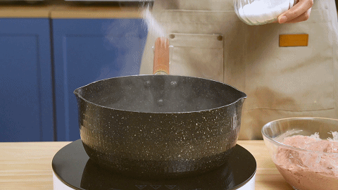 4.烧一锅热水,水开后加少许盐调味,调至小火,用饭勺装肉泥抹平,然后用软刮刀一点点的刮入沸水中,开大火将肉片煮至全部浮起再煮1分钟
