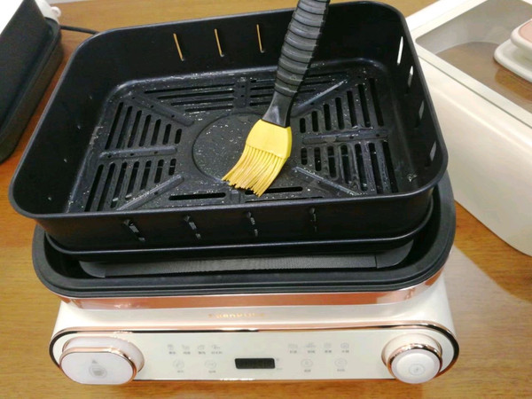 把接油盘和炸篮放入机器上,用油把炸篮用食用油刷一层(方便清洗)。