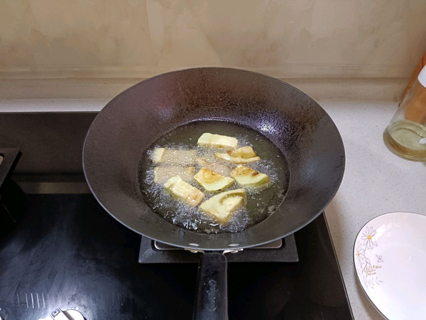 捞出炸好的茄子块之后开始煎炸第二批茄子块。