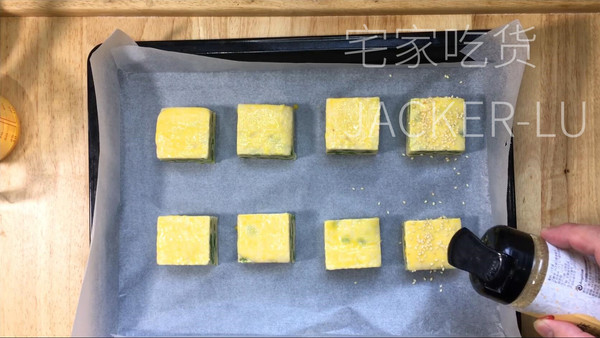放在烤盘上,表面涂一层蛋黄液,再撒一点芝麻点缀。