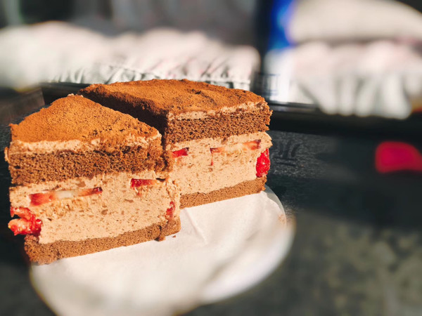 混和后,在模具里,一层戚风片,一层巧克力液,放一点草莓丁,再放一层戚风片,把剩下的巧克力液倒进去,冷藏俩小时,上面撒可可粉,装饰就可以了