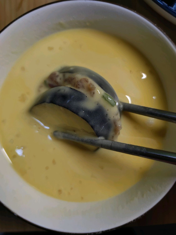 肉馅加料酒,盐,葱花和蒜末朝一个方向快速搅拌