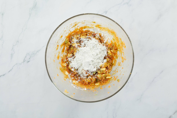 ▲3、在肉泥中加入盐、玉米粒、切碎的生菜搅匀。