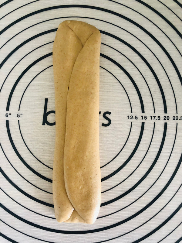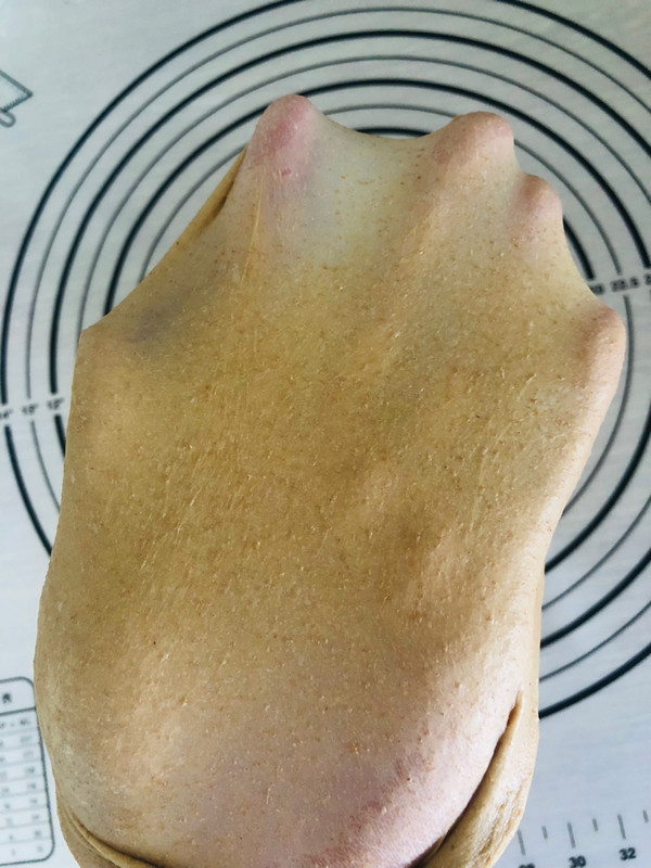 因为全麦面种的加入整个面团的揉面时间会变短,大家注意不要揉过了,时不时检查一下,我这里用厨师机中速揉面大概5-7分钟出现粗膜。