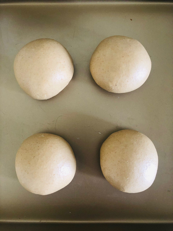今天依然采用一次发酵的方法,把揉好的面团平均分成四份,搓圆盖上保鲜膜松弛二十分钟。