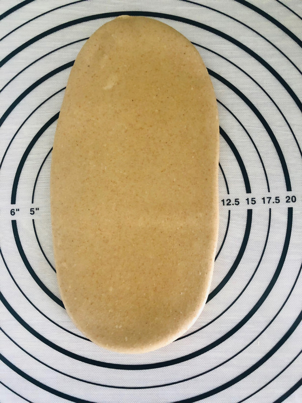 取一个松弛好的面团,光滑面朝上,擀成牛舌状。