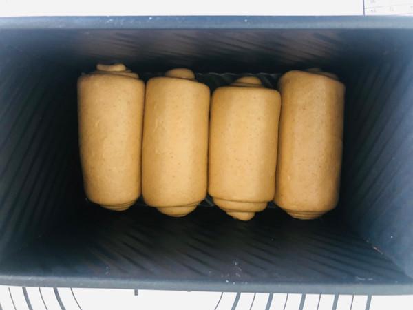 方向一致的排入吐司盒中,盖上保鲜膜温暖处发酵到9分满,快发酵好的时候预热烤箱上火160,下火180,时间25分钟,我这里用的低糖吐司盒,大家如果用普通吐司盒,上下火各加20度,时间30分钟。