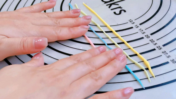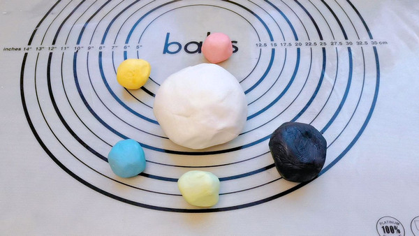 白色面团分成4个20g,加入仙人掌果粉、南瓜粉、羽衣甘蓝粉、蝶豆花粉调色。