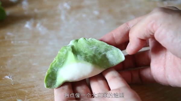 在菠菜厚面片上刷一层清水,将白色面团放在正中,小心包裹起来,并捏合封口,揉搓至光滑后切成面剂子。