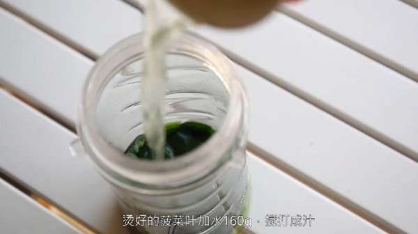 在锅中加1克盐,放入菠菜叶烫软后捞出沥水,加160克清水搅打成汁。