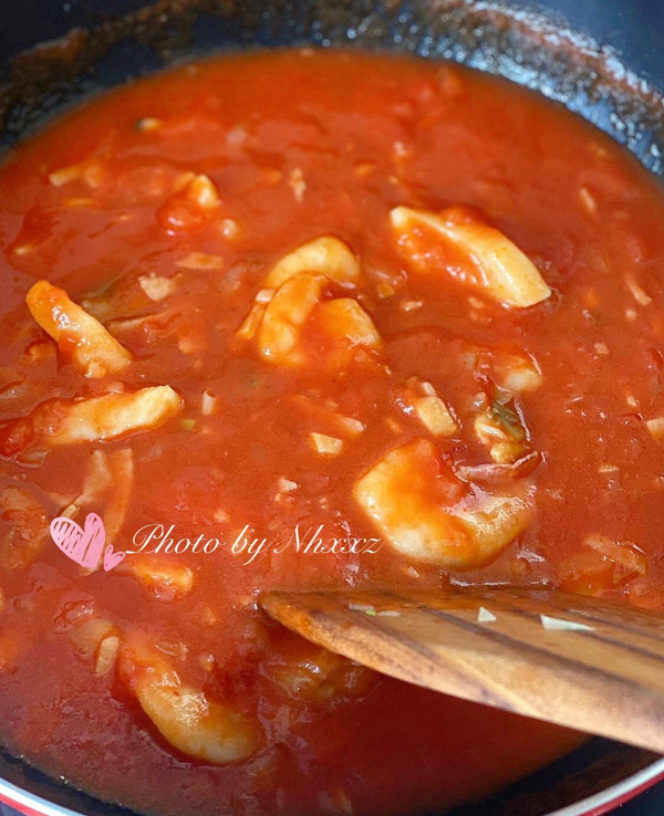 加入番茄碎罐头和味淋煮开,转小火煮5分钟,再加入砂糖和酱油搅拌均匀,再加入牛奶关火,备用