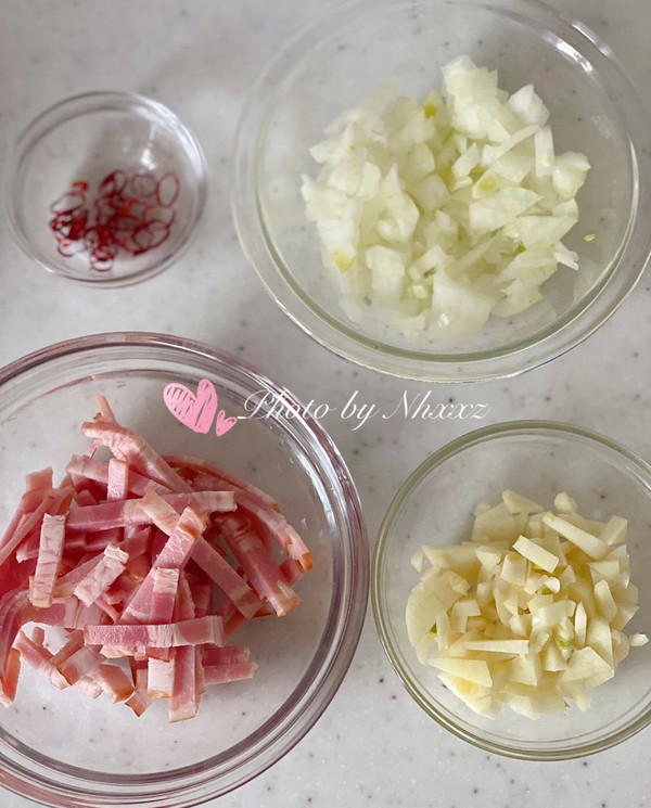 培根切条,大蒜和洋葱切末,备用