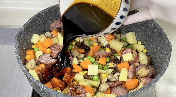 把这个菜倒进来,盖上锅盖按煮饭键,正常蒸米饭就可以了。