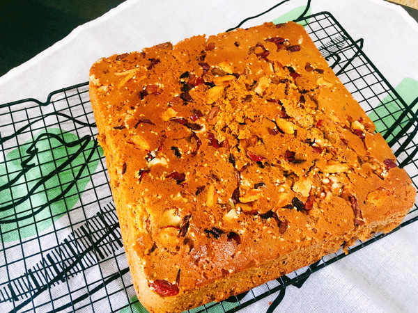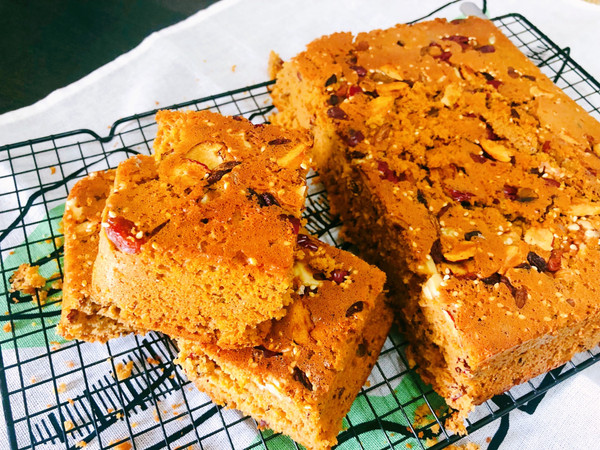 放凉以后就可以切块食用了,这款枣糕在表面铺了很多坚果,看起来非常有食欲,而且也增加了枣糕口感上的层次,这款配方里没有泡打粉会比较健康,用做海绵蛋糕的方法做枣糕,枣糕的组织松软细腻像蛋糕一样,入口即化,非常适合做早餐或者下午茶的甜点。