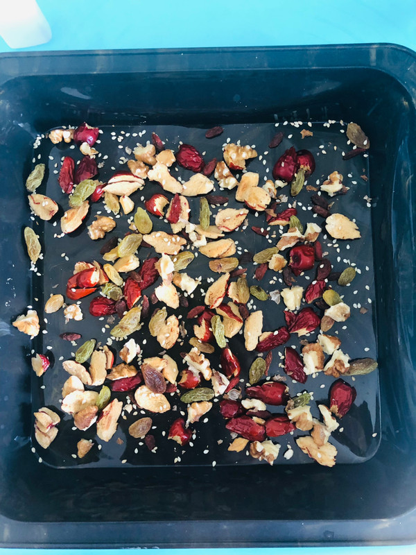 首先我们来准备模具,我用的是23×23×6的方形不沾模具,大家可以用6寸蛋糕模具,材料减半,用蛋糕模具的话记得垫上油纸防粘,在模具底部撒上自己喜欢的各类坚果,我用了提子干,核桃碎,白芝麻,红枣碎。