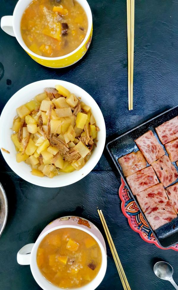 一人一碗,又煮了牛肉萝卜 煎了午餐肉,又是一顿没有绿色的午餐