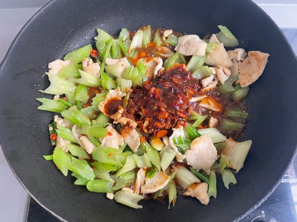 起锅烧油放入鸡胸肉加一勺料酒炒熟