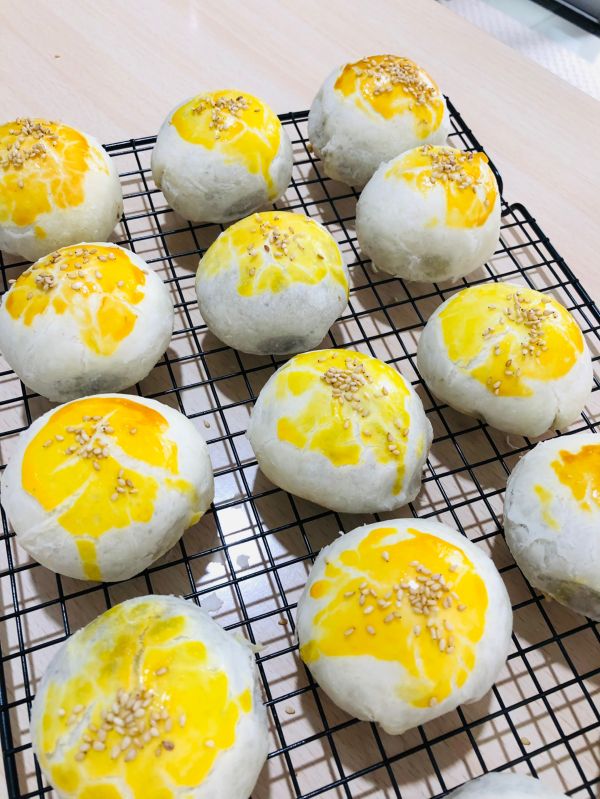 包好的蛋黄酥稍微松弛10分钟,烤箱180度上下火预热