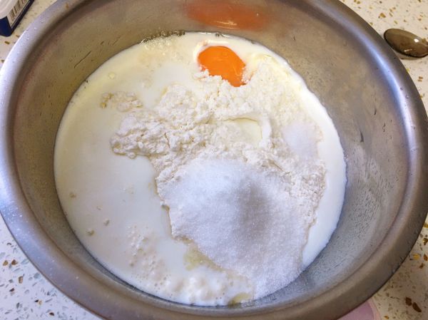 高筋粉+酵母+盐+白砂糖+鸡蛋,酵母与盐不要放同一处
