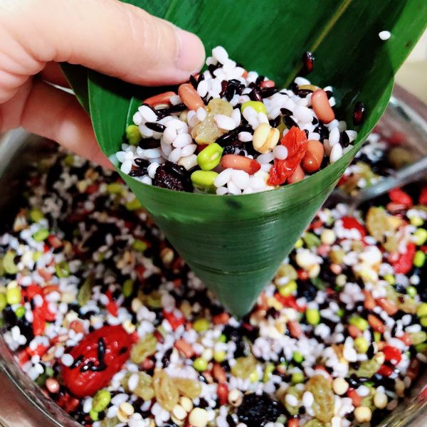 八宝米提前泡5-6小时,杂粮豆子可以自由搭配,再放入红枣、葡萄干、枸杞子,让整个粽子都会有酸甜的口感。