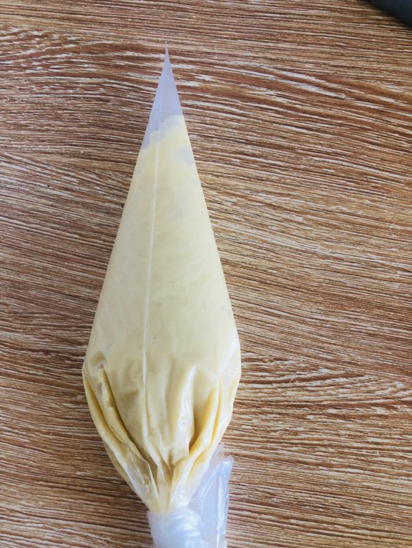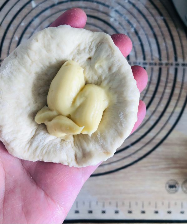 取一个松弛好的面团,按压成薄饼装,包入20克豆乳卡仕达酱(做法在最后)。
