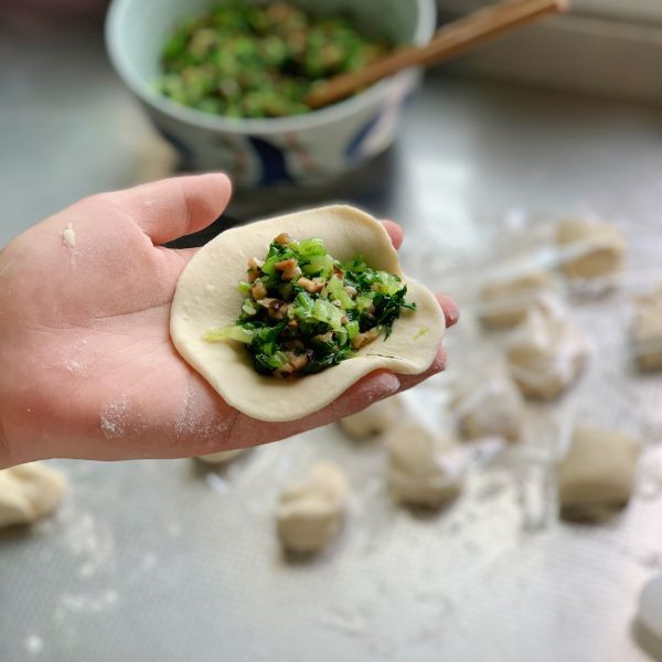 面团揉成长条,分成大小均匀的小剂子(大约30克/个),小剂子擀成中间厚四周薄,装入馅料,包好