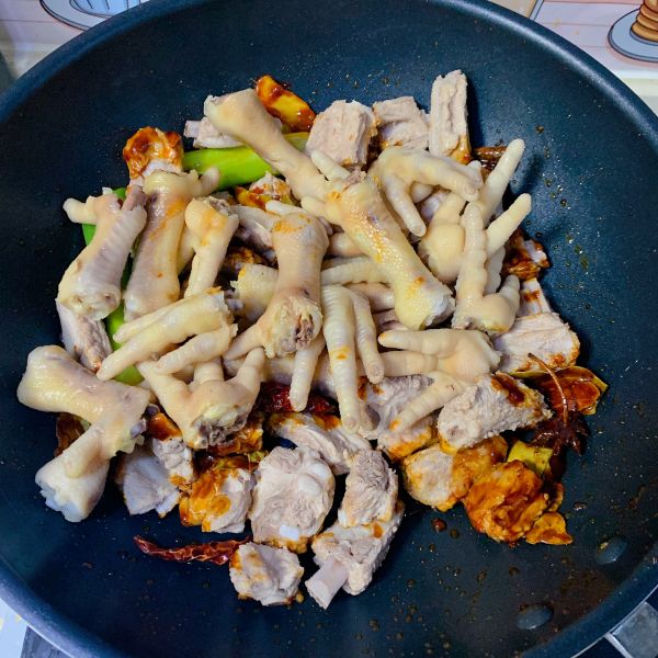 加入适量热水 热水量以没过鸡爪排骨为宜