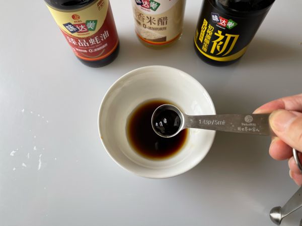再准备一个碗放一勺凉开水,一大勺生抽。