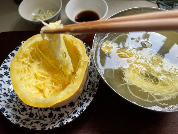 这个时候金瓜也蒸好了,(用筷子夹一下金瓜一丝丝出来就可以了)