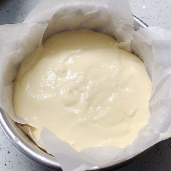 6寸蛋糕模垫油纸,倒入芝士糊,倒入的时候过筛一下震动几下,磕出大气泡,稍微刮平表面。