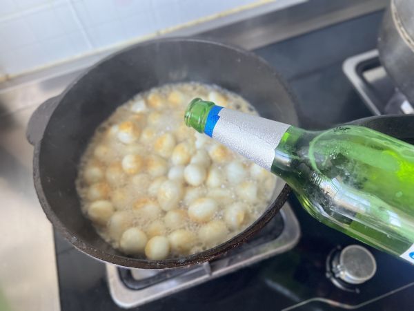 炒锅放两勺油放入鹌鹑蛋煎至虎皮色