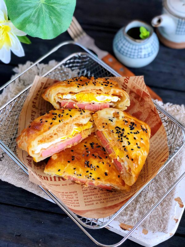 分别在手抓饼的四个象限放肉松,煎蛋,马苏里拉芝士碎(提前室温软化)和火腿片