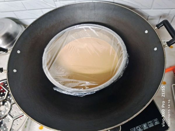 烤盘震几下,把里面的气排出来。这样蒸好的比较细腻不会出现大孔。准备两个大锅,加入适当水先煮开。水开上锅蒸30分钟,蒸的时间取决于浆的厚度。厚点就要蒸久点。蒸好闷5分钟就可以取出放凉。