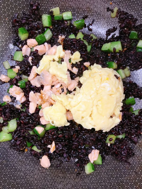 放入炒好的鸡蛋和三文鱼