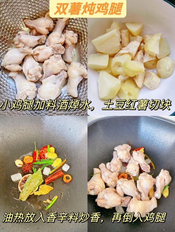 【所需食材】 鸡翅根、土豆、红薯、香辛料:3个干辣椒、1个八角、3片香叶、1个桂皮、3个干山楂、3片姜片、葱等(按自己喜好添加)