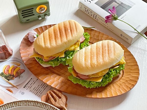 多功能锅放上牛排盘,调至煎烤档,将短棍面包剖成二片,煎至表面微焦,可以借用铲子轻轻压一下,使表面纹路更漂亮;