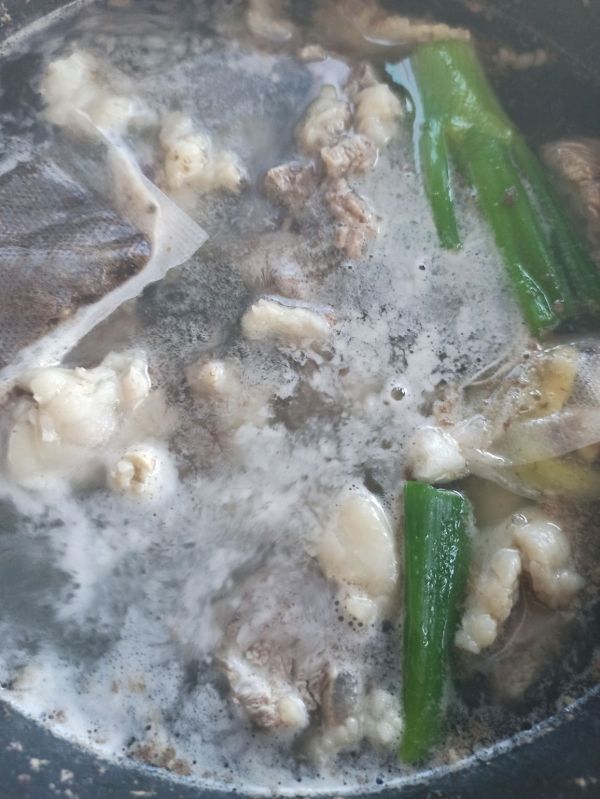 重点②,老回民教的炖牛肉一次入水,不焯水不加水 ,中大火煮沸后,撇撇血沫,放入调料,料酒再煮沸,调小火。 温馨提示,根据锅不同加水量也不同,只能自行掌握,我用的明火正式炖锅,没过肉两指宽。