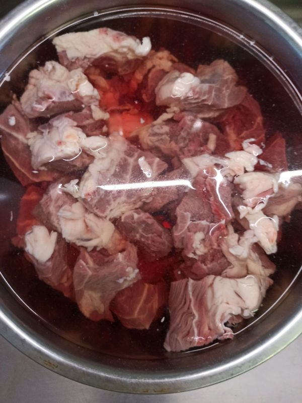 重点①,牛肉用冷水加淀粉浸泡一小时,中间更换一次水,抓一抓冲洗干净,这样泡过的牛肉血沫很少,味道更好
