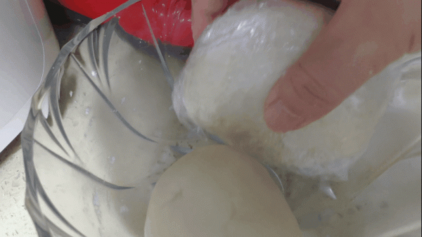 先来做水油皮。面粉放入碗中,加入清水搅拌成絮状。