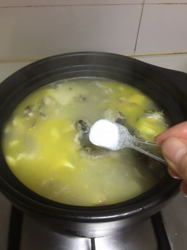 把昂刺鱼汤倒入砂锅,加入嫩豆腐,煮开