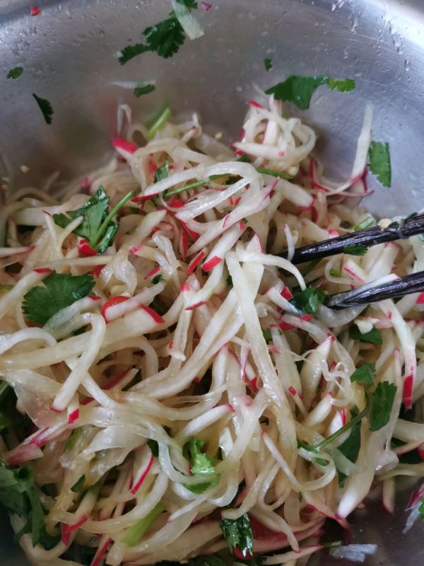 拔萝卜切丝,放入盐巴腌制20分钟杀一下水分,把杀出来的水倒掉。
