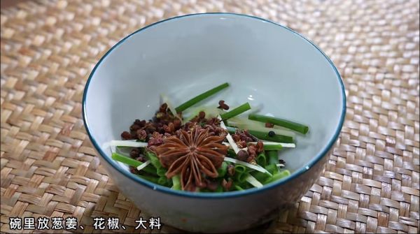 做料水:葱姜,花椒,大料,热水泡一下,晾凉备用。